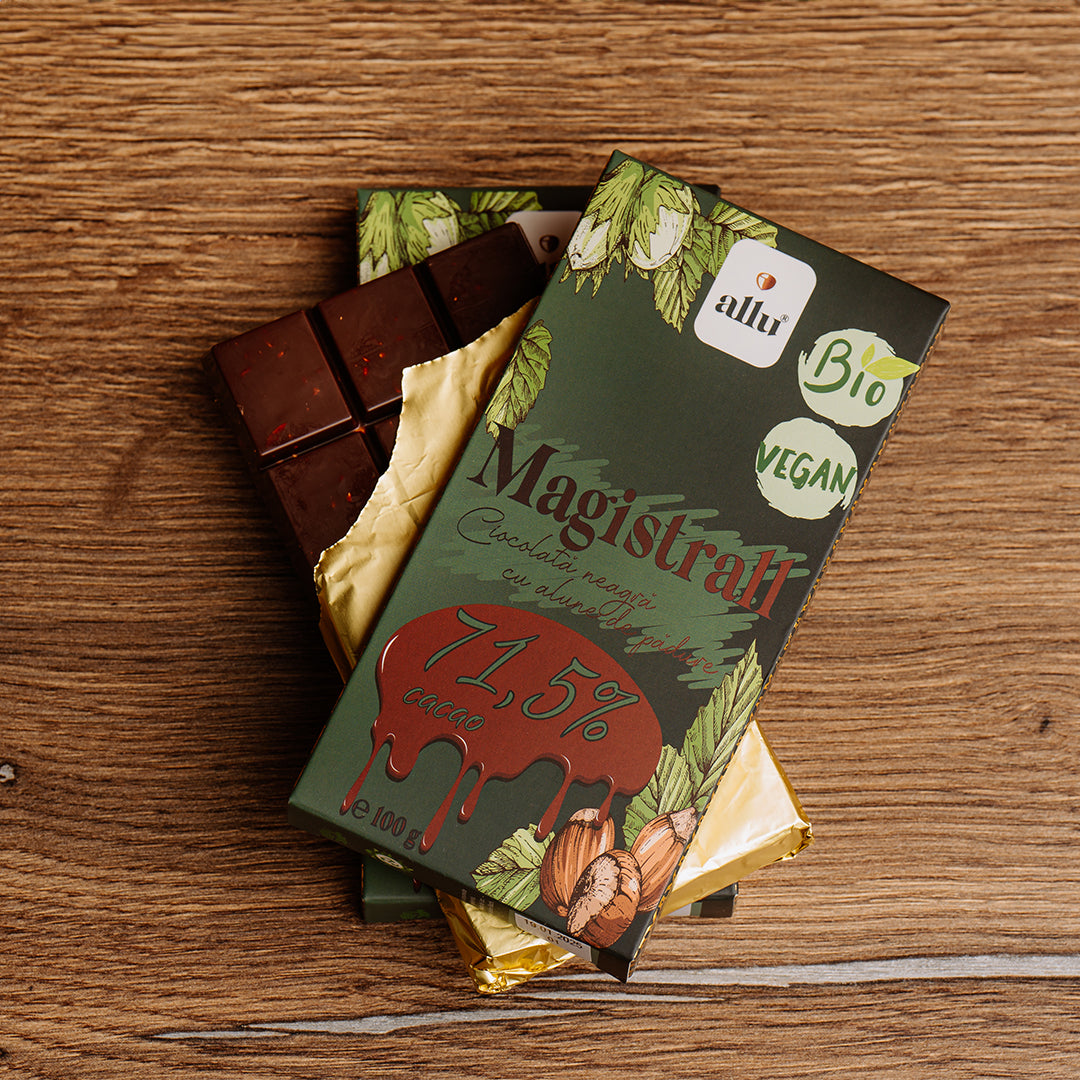 Each bite is a symphony of flavors: crunchy hazelnuts, like a discreet echo of nature, intertwine with dark chocolate, creating a refined balance between their subtle sweetness and the robustness offered by the generous 71.5% cocoa content. All certified organic ingredients are carefully selected, guaranteeing superior quality and a deep respect for nature. Magistrall is more than a treat - it is an invitation to savor small moments of joy, an escape into a world of authentic indulgence.