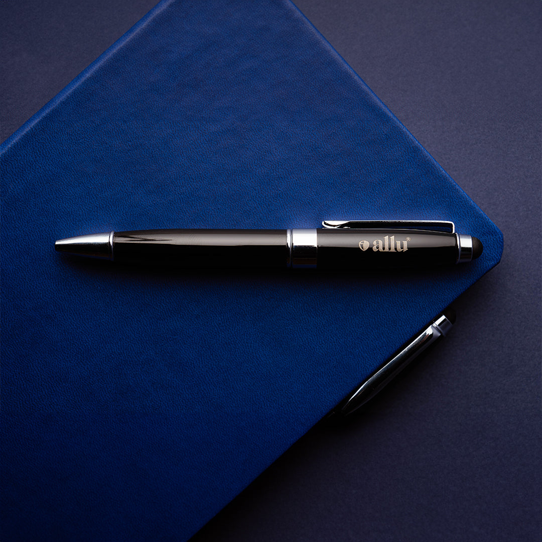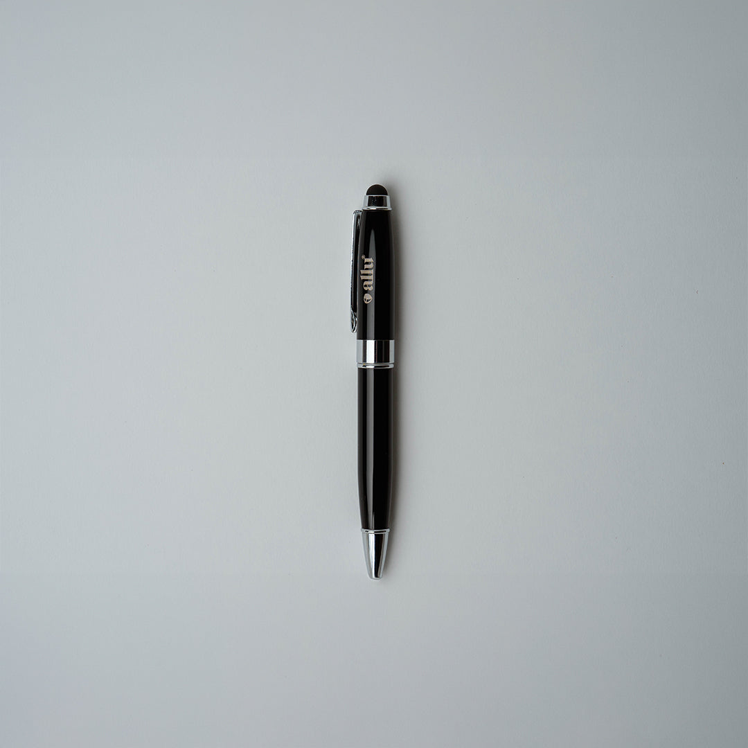 Classic elegance and modern technology are combined in this phone pen. With a glossy black metal body and engraved Allu logo, this pen not only looks distinguished, but also feels great in the hand thanks to its ergonomic design. The shape and embossed details of the pen ensure a comfortable grip, ideal for long writing sessions.