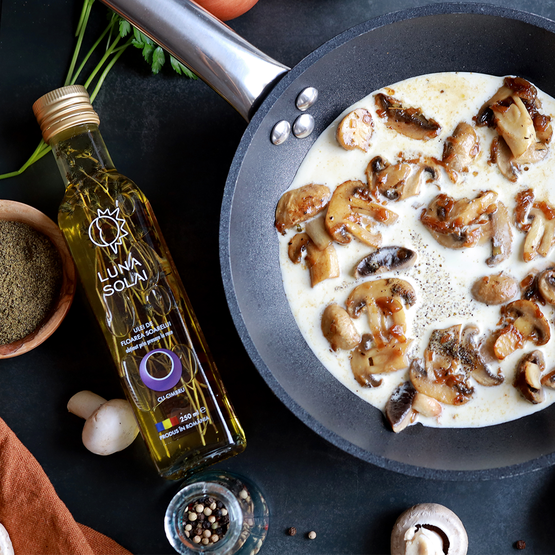 A natural product, inspired by traditional Romanian cuisine, extracted without thermal processes from sunflower seeds, flavored with dried thyme.