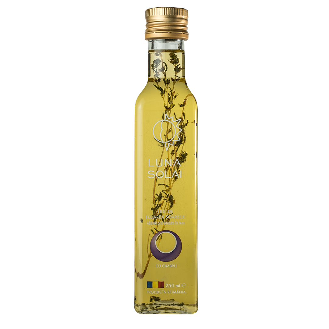 Sunflower oil with thyme, obtained by cold pressing, has a golden yellow color, viscosity and a special aroma, specific to sunflower seeds, and a warm, slightly spicy taste of thyme.