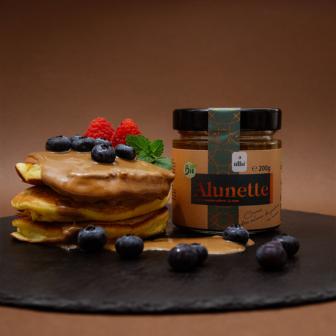 În adâncul pădurilor, unde alunii și albinele își trăiesc viața în simbioză perfectă, se naște Alunette cu miere. Cu fiecare borcănel deschis, te întorci la marginea pădurii, simțind dulceața mierii pure, combinată cu bogăția alunelor fin măcinate. Un duet perfect, ambele ingrediente provin din surse ecologice, păstrându-și puritatea și vitalitatea. Această cremă reprezintă echilibrul dintre dulce și savuros, o îmbinare ce aduce pe papile gustul puternic al pădurii și dulceața zilelor de vară. Alunette cu miere este o invitație la un festin al naturii, în fiecare linguriță.