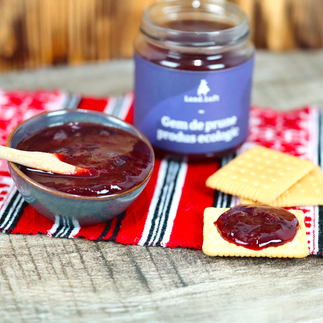 Savurează aroma bogată a prunelor transformate cu grijă într-un gem sănătos și natural – un răsfăț autentic pentru orice moment al zilei.