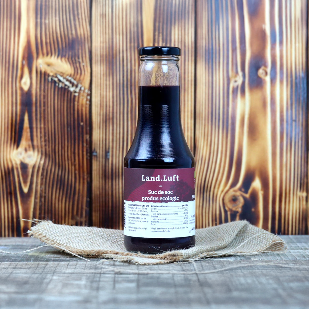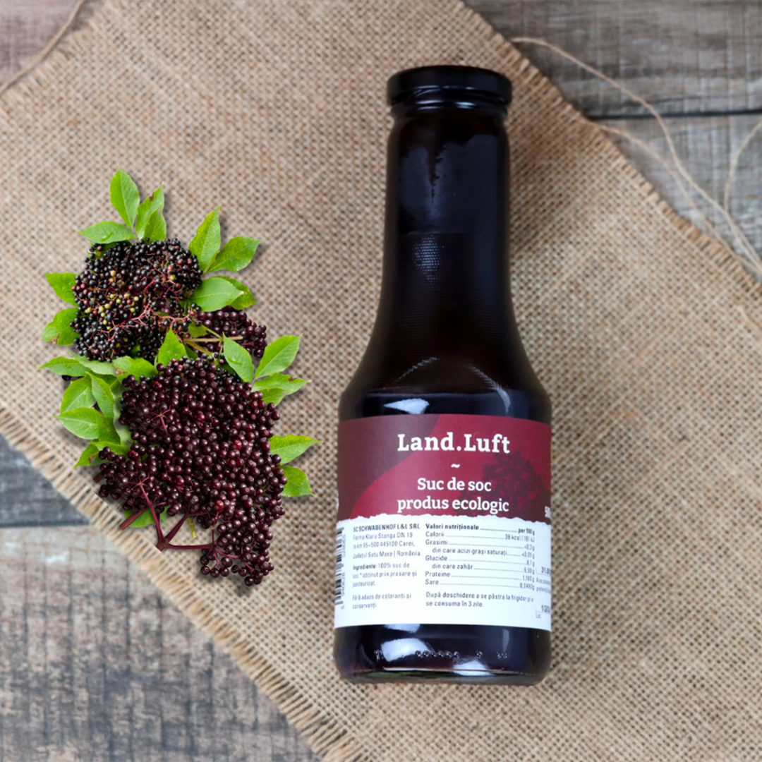 🍇 Suc din boabe de soc BIO presat la rece – un tonic natural, 100% pur, obținut exclusiv din fructe ecologice din cultura noastră proprie. Cules manual și transformat rapid prin presare la rece, acest suc păstrează toate proprietățile naturale și aroma autentică a bobului de soc.